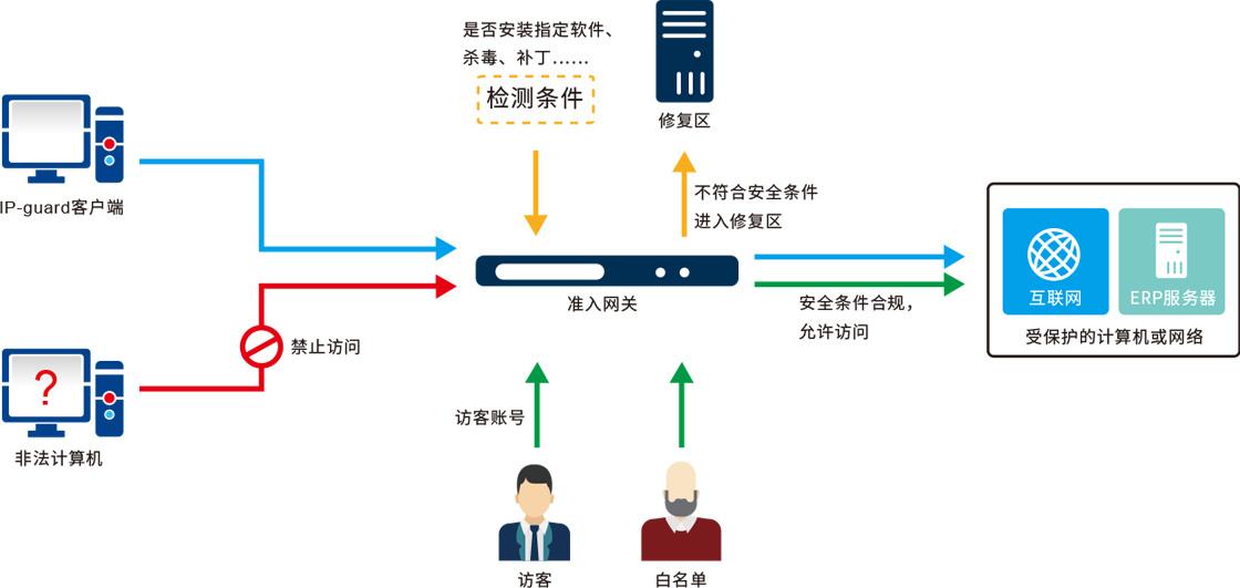 準(zhǔn)入網(wǎng)關(guān)+網(wǎng)絡(luò)控制+應(yīng)用程序管控+資產(chǎn)管理,實(shí)現(xiàn)準(zhǔn)入條件檢測(cè)和更加完善的準(zhǔn)入功能。