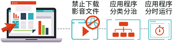 · 限制用戶使用指定應(yīng)用程序的權(quán)限,防止存在安全風(fēng)險的程序運行。 · 支持對應(yīng)用程序進行分類控制。 · 支持分時段進行控制,實現(xiàn)人性化管理。